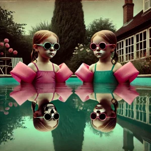 Dos niñas con gafas y manguitos observan su reflejo en la piscina; una de ellas muestra un rostro de calavera bajo el agua.
