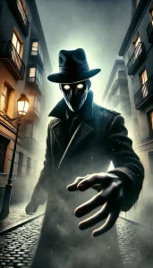 Figura encapuchada con abrigo largo y sombrero negro caminando entre la niebla en una calle solitaria